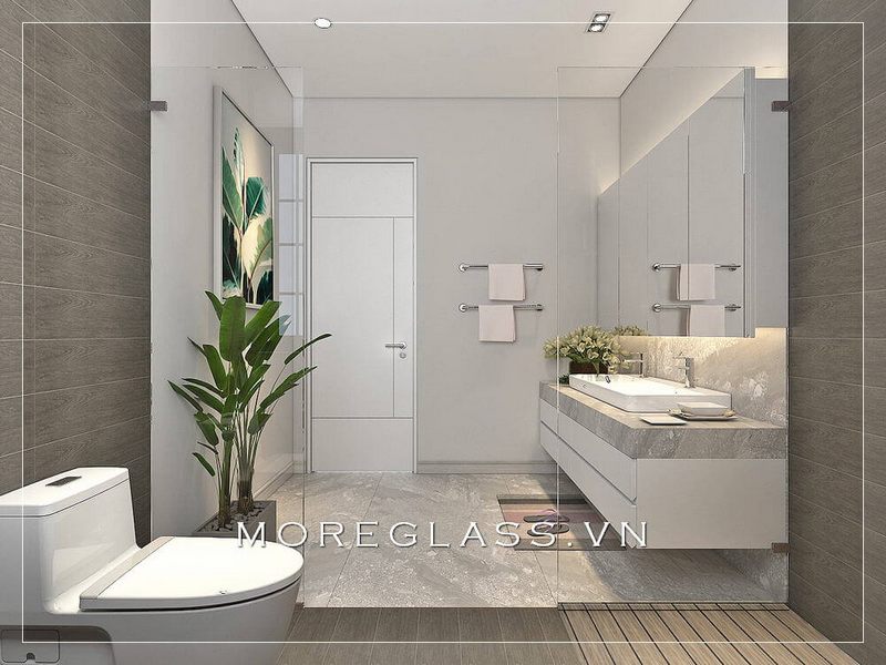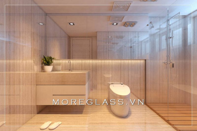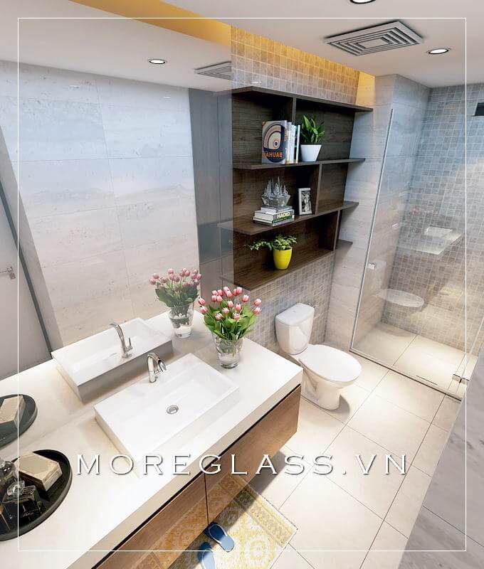 Mẫu thiết kế nhà vệ sinh hiện đại của chung cư đã kết hợp với phòng tắm kính cường lực cao cấp, giúp tạo ra không gian tiện nghi và thoải mái mà không bị chật trội.