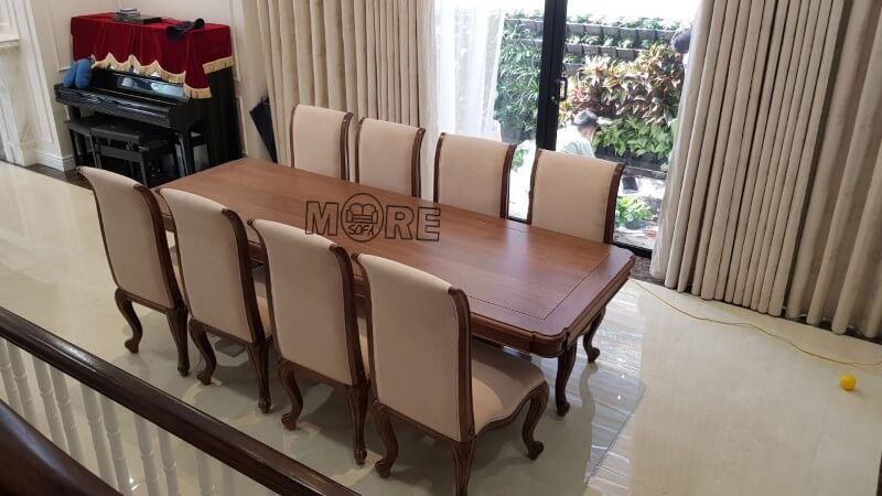 Thi công bộ bàn ăn 10 ghế gỗ óc chó có tựa thoải mái vững chắc, diện tích rộng rãi thoải mái cho quá trình sử dụng