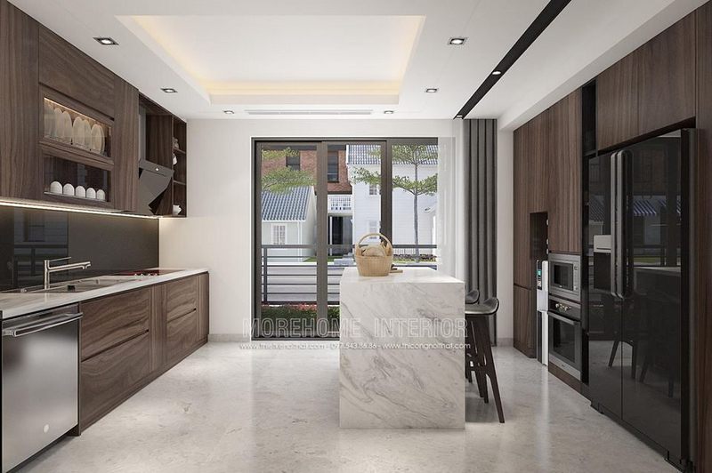 Tủ bếp gỗ công nghiệp hiện đại với mặt bếp ốp đá màu trắng sẽ làm nổi bật không gian phòng bếp của nhà biệt thự.