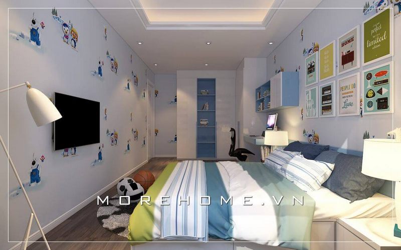 Giấy dán tường màu trắng kết hợp với họa tiết độc đáo đã giúp bức tường tránh sự thô cứng, tạo nên một điểm nhấn cho phòng ngủ của bé trai và thêm sắc màu cho căn phòng.
