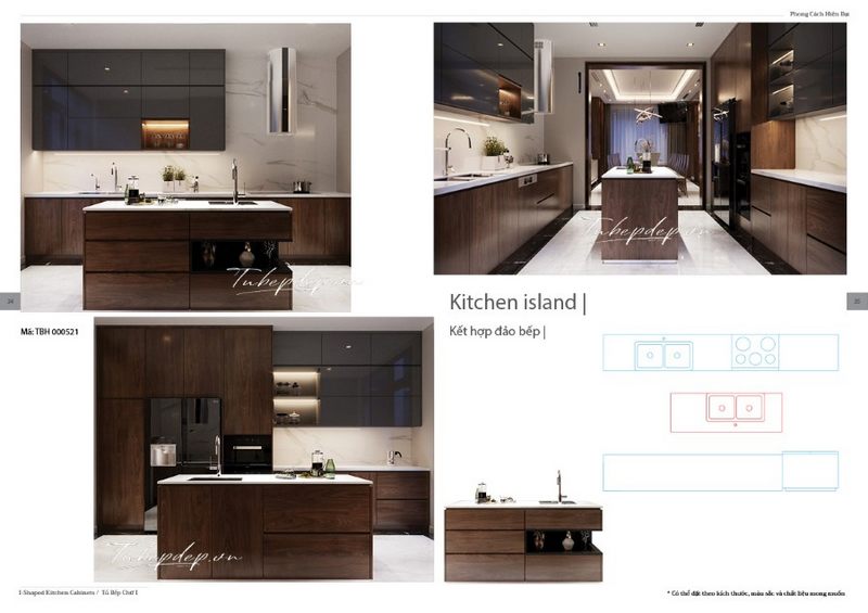 Tủ bếp được thiết kế để đảo bếp, cung cấp thêm không gian để lưu trữ nhiều đồ đạc hơn, đồng thời có tính tiện nghi và sang trọng.